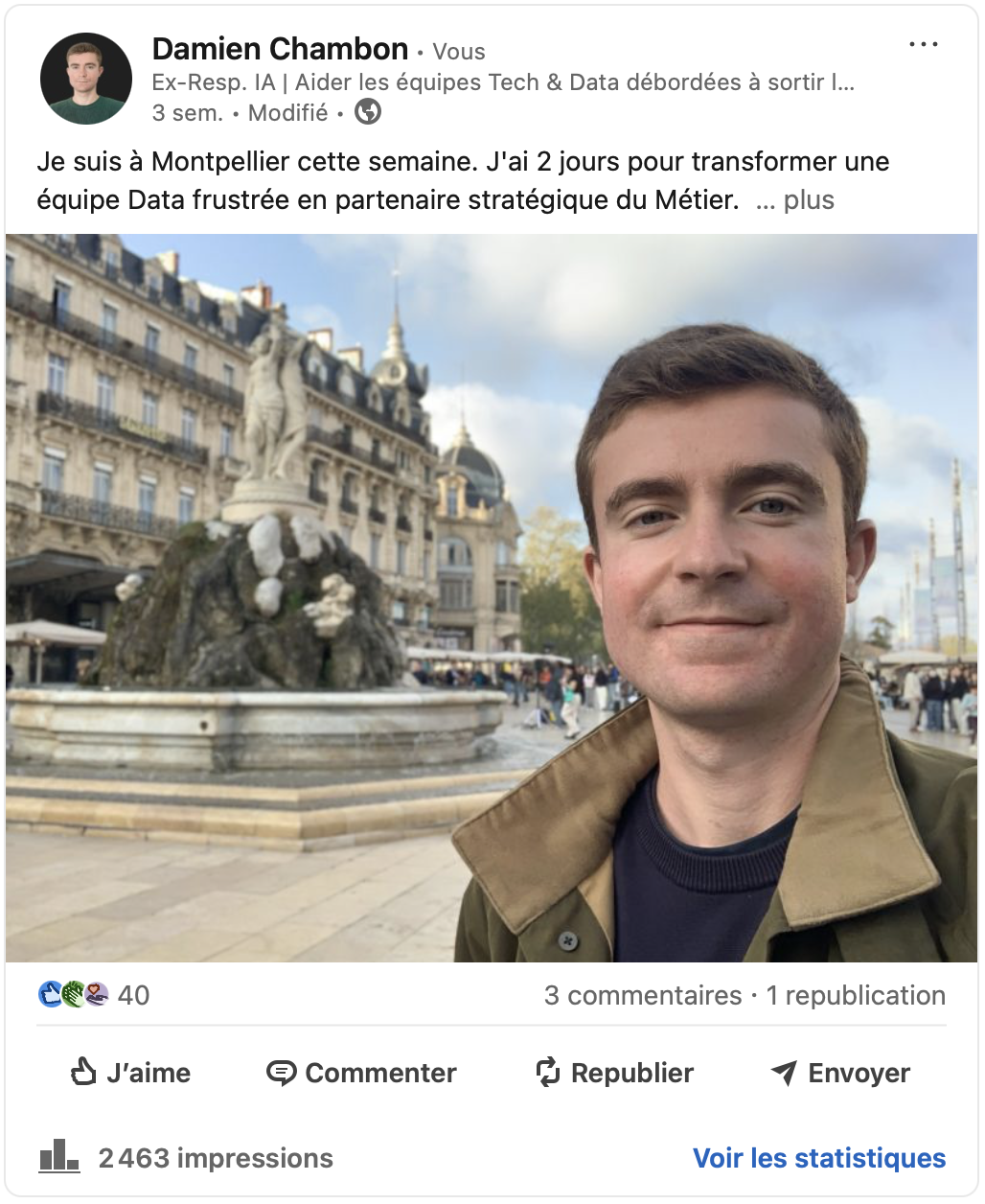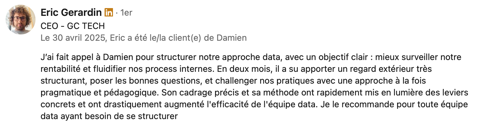 J'ai arrêté les projets ponctuels. Je propose des accompagnements stratégiques long-terme pour les entreprises du digital qui sont débordées sur l'IT et la Data. Ainsi que des ateliers de formation et des conférences sur mon approche.