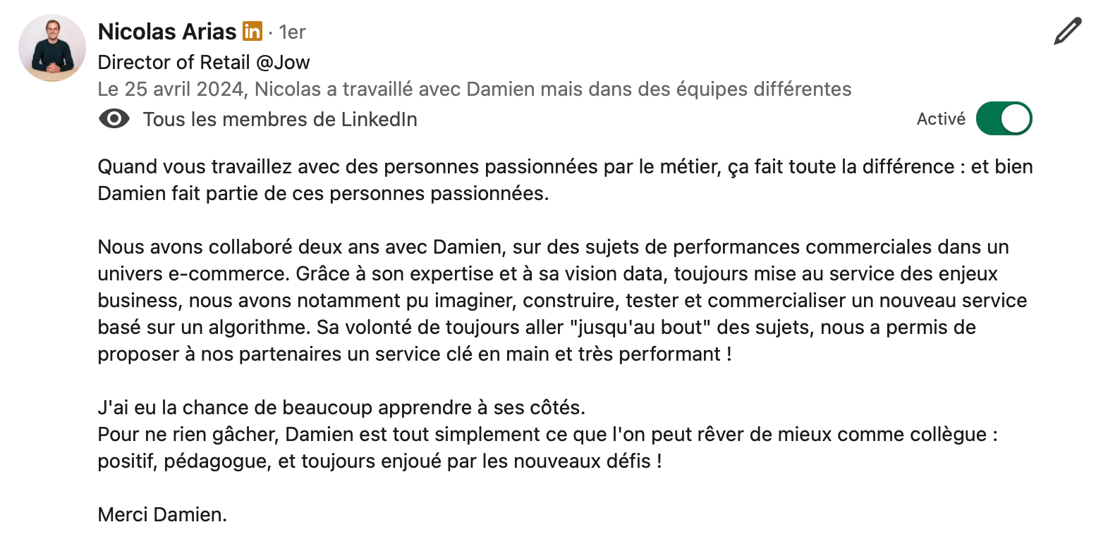 Il m'a mené ensuite jusqu'à la direction de l'IA chez Jow (5 millions de clients par mois, application Food #5 sur l'AppStore), où mes algorithmes influençaient 5 millions d'utilisateurs, et ont permis entre autres d'augmenter la conversion de 10%.