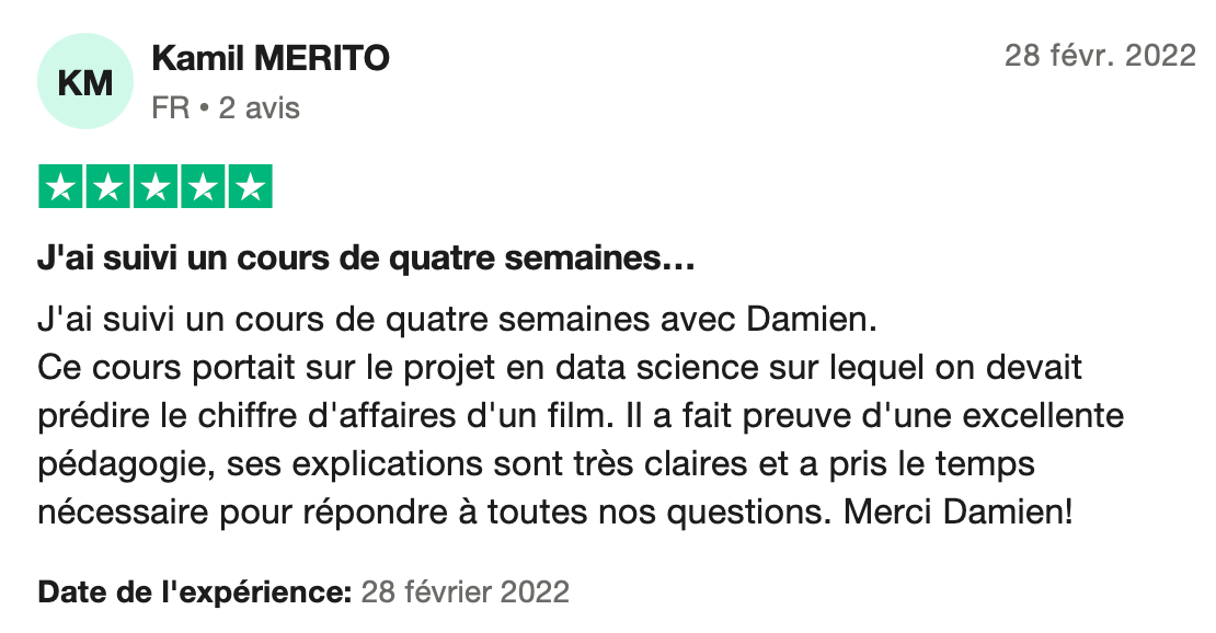 Pendant la période Covid, je lance mes premières formations en ligne pour partager mes connaissances en Data Science et Machine Learning. Le succès est au rendez-vous : +2000 personnes qui suivent ma newsletter, 4 formations lancées, 500 personnes formées, 7000 abonnés YouTube dont une vidéo à +90 000 vues. Une nouvelle façon de transmettre ma passion.