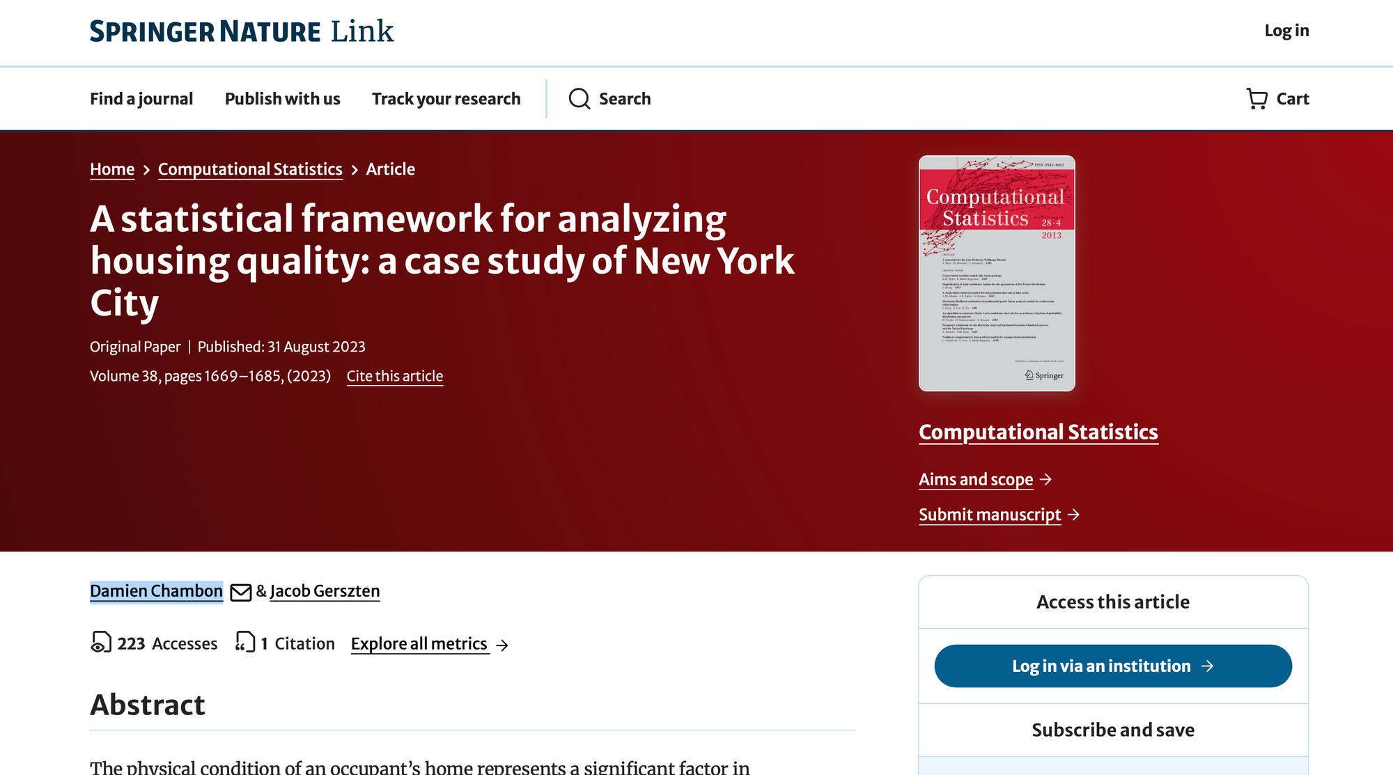 C'est durant cette année que je découvre le Machine Learning, la base de l'IA. Pour un cours, on a même recréé "Les Experts" en prédisant des crimes grâce à l'IA. Je participe aussi à un concours d'analyse de données sur la qualité de vie des New-Yorkais. Notre solution décroche la 2ème place au sommet de l'American Statistical Association à Denver. (Le petit Damien qui n'osait pas réciter ses poésies en primaire se retrouve à présenter devant 100 experts). La cerise sur le gâteau ? Une publication dans une revue scientifique Springer.