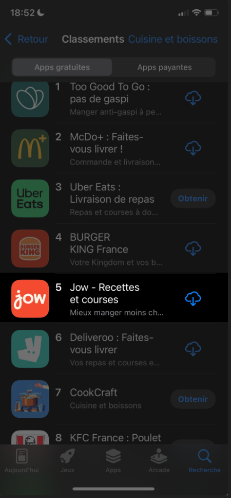 Je découvre l'application Jow pendant le confinement, en cherchant à aider ma mère dans son quotidien. Cette app qui aide à répondre à la question "qu'est-ce qu'on mange ce soir ?" m'impressionne. Elle est utilisée chaque mois par +5 millions d'utilisateurs. Elle se place #5 sur l'AppStore, dans la catégorie Food, devant Deliveroo et KFC. Je postule fin décembre 2020 pour un stage de fin d'études, et 10 jours plus tard, je reçois une réponse positive.