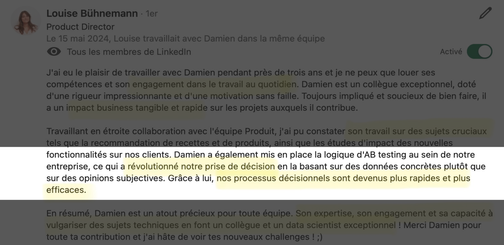 Ce qui devait être un stage de 6 mois se transforme en une aventure de 3 ans. L'environnement m'anime : carte blanche sur les sujets, apprentissage constant, contact direct avec toutes les équipes (contenu, acquisition, marketing). Je passe rapidement de data scientist à responsable de toute la partie IA : algorithmes de recommandation, personnalisation de l'expérience client, création d'outils internes, conception d'API...